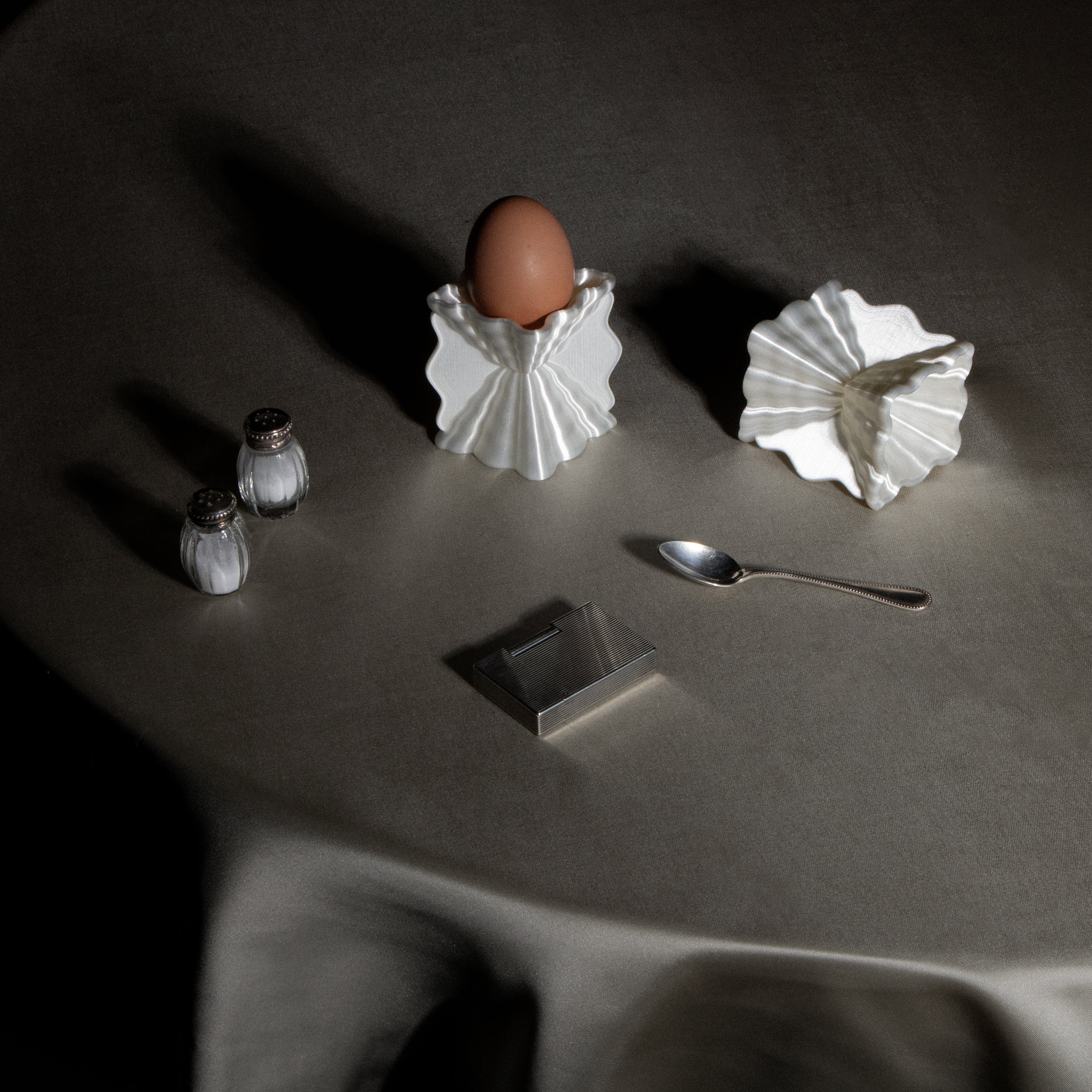 This eggcup pays homage to the classic shapes of Greco-Roman cups, associated with the wavy imprints that the sea leaves on the sand as it recedes. Its pearlescent appearance captures and reflects light, giving it a subtle and elegant presence.