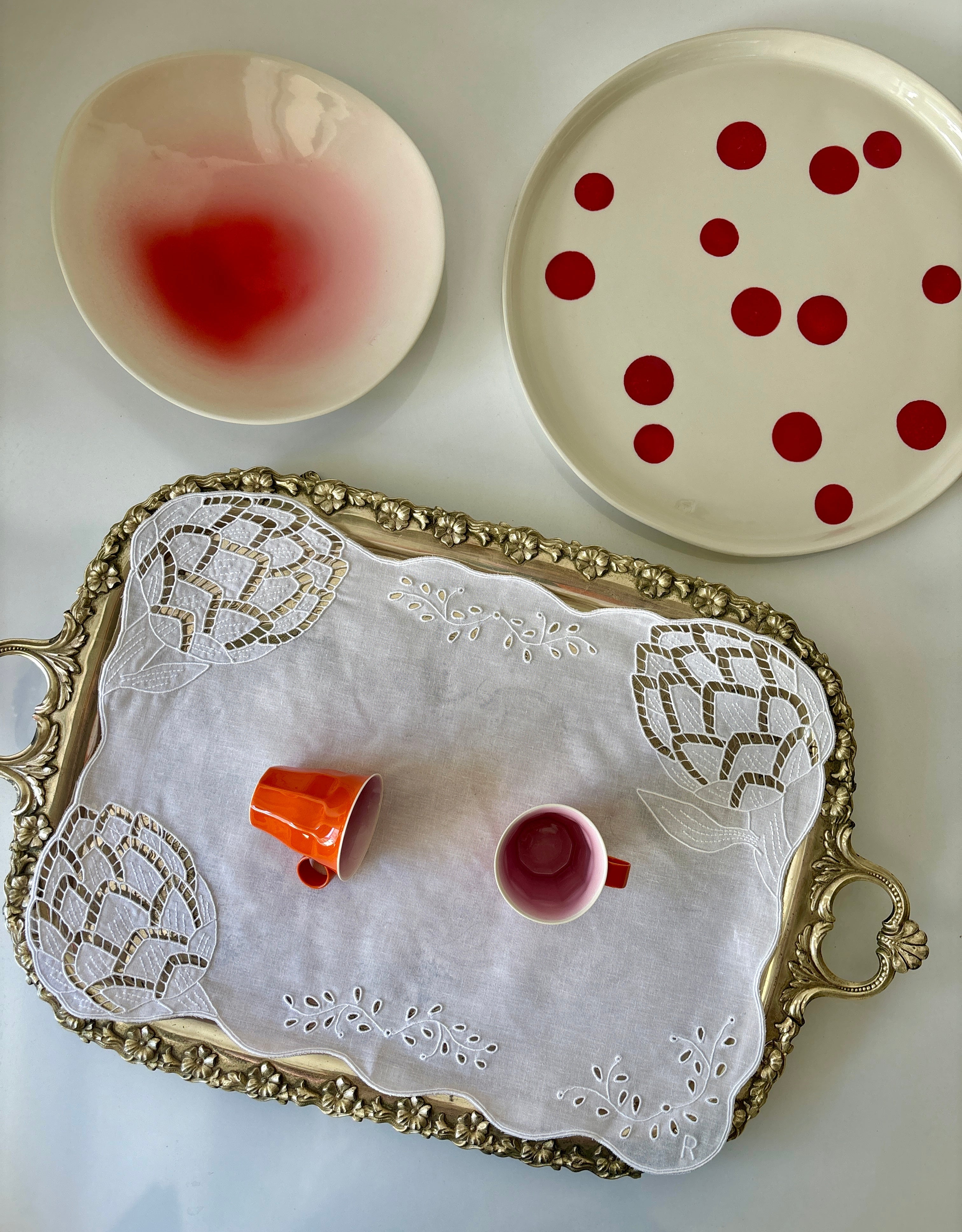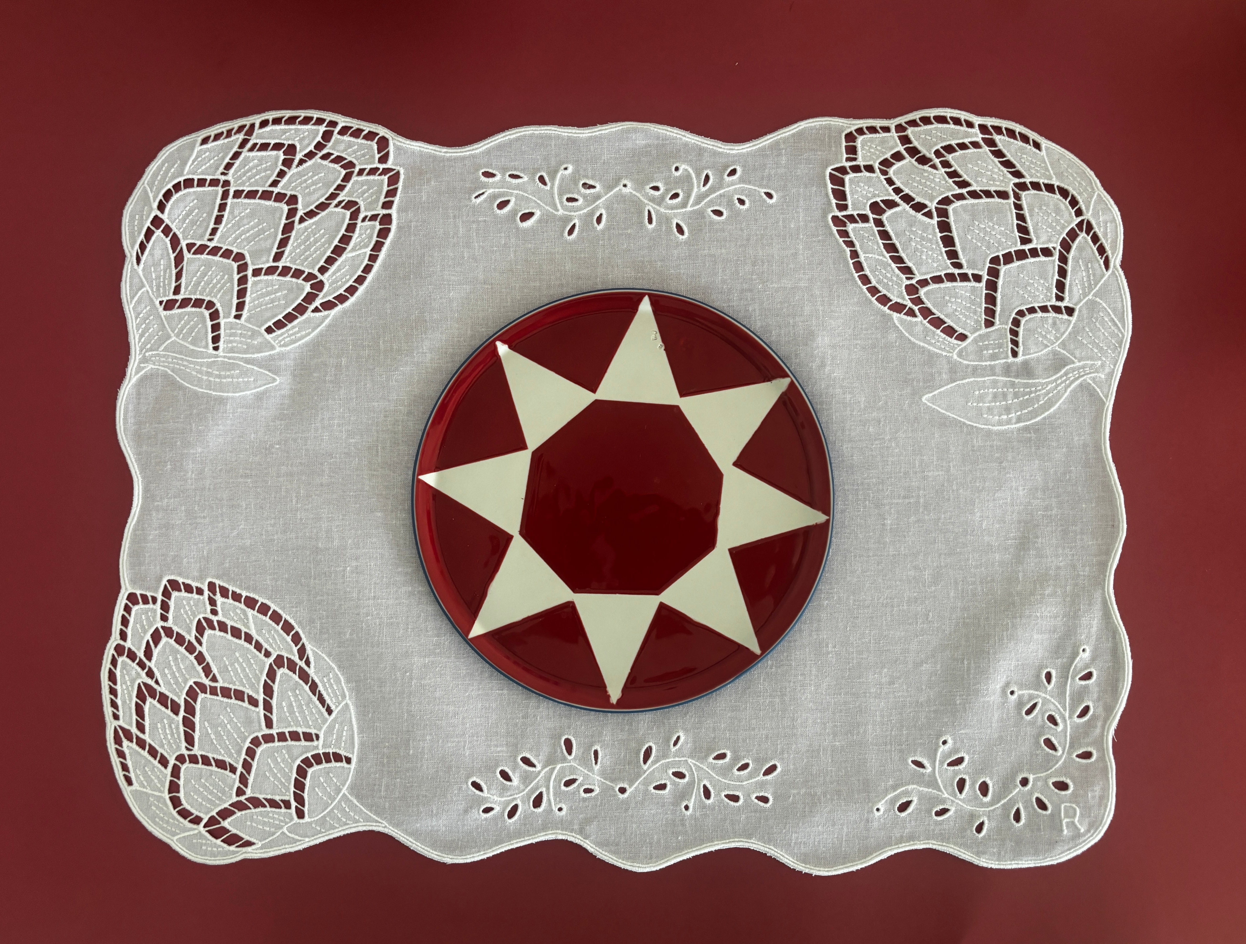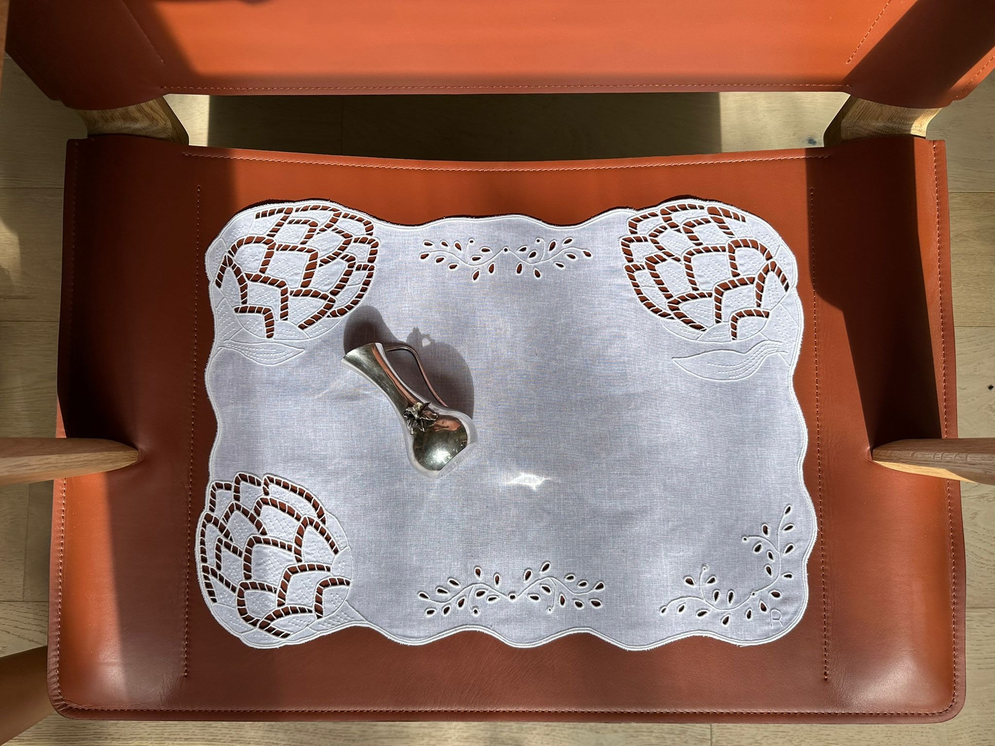 Hand crafted by Anatolian women artisans, this linen placemat highlights the artichoke’s layered form through intricate cutwork. Each petal reflects techniques once refined by Ottoman artisans, giving the piece sculptural depth and a timeless, botanical character.